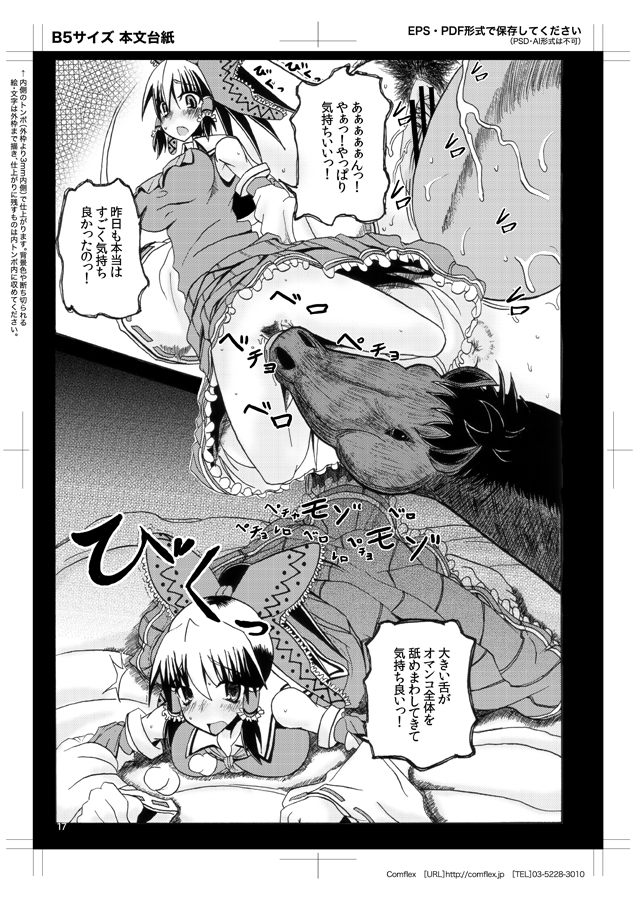 こちらが表紙になります。馬が表紙に出てる 東方のエロ同人とか見た事ないので 作業しながら何度も「大丈夫なのかこれ」 って思ってましたwwタイトル等のフォントは S R H様のcacaoを使用させて頂きました では以下サンプルです~ こんな感じの本です!獣姦の和姦なので 獣姦好きだけど無理矢理はちょっとな~という 人向けかもしれません( ^ω^) 8月13日(土)の二日目にテ-39a「頚部」でお待ちしております(^ω^) |